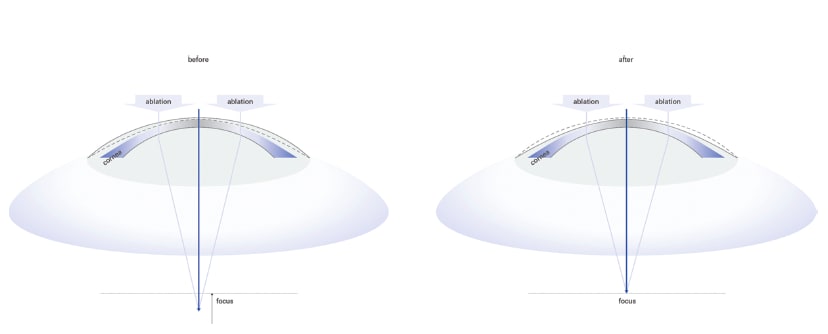 Two different laser types are used for these refractive operations: excimer lasers and femtosecond lasers. The latter work in the infrared range and send light pulses with a duration in the femtosecond range (one femtosecond is equal to 10-15 sec). The laser energy is not discharged on the surface of the cornea but inside at a predetermined depth for a duration of several femtoseconds. In this way, tissue can be cut with extreme precision and practically without generating heat. This can be used in the above-mentioned LASIK method to remove the thin corneal flap. Femtolasers can also be used to prepare corneal tunnels for intracorneal implants, for example, for artificial lenses.
