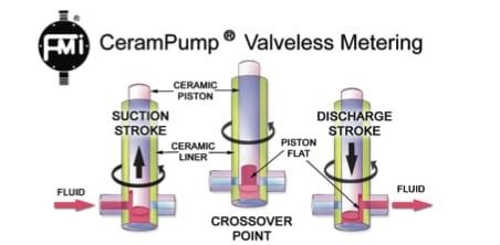 In addition to reciprocating, the piston also simultaneously and continuously rotates in one direction. The piston is designed with a flat cut into the end closest to the inlet and outlet port (see Fig. 1). As the piston rotates, the flat is alternately aligned with the inlet and outlet port, essentially functioning as a valve. At no time are the inlet and outlet ports interconnected; therefore, the need for check valves is eliminated. One complete synchronous rotation and reciprocation is required for each suction and discharge cycle as shown in Fig. 1. An animation of continuous metering using the CeramPump® principle can be found on Fluid Metering’s Web site.