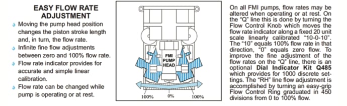 The piston displacement (or volume pumped per stroke) is variable and controlled by the angle of the pump head to the drive. When the pump angle is zero, the pump head is in straight alignment with the drive, and the flow is zero. In this situation, there is no reciprocation and the piston is only rotating. As the angle of the pump head increases above zero in either direction with respect to the drive, the piston reciprocates, and fluid is moved through the pump (see Fig. 2). The greater the angle, the greater the displacement per cycle (also know as stroke). Adjustment is infinite between zero and 100%, and a flow rate indicator provides for accurate and simple linear calibration. The pump is designed so that at any angle and flow rate, the piston always bottoms for maximum bubble clearance. This is especially important for very small dispenses and flow rates, as the presence of even a minute bubble will significantly affect accuracy.
