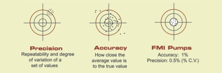 Consistency in dispensing can be measured by monitoring both the accuracy and precision of the dispenses. Accuracy is a comparison of the average value of the dispense volume compared to the desired or target value. Precision is the range or degree of variation from dispense to dispense. See Figures 3 & 4.