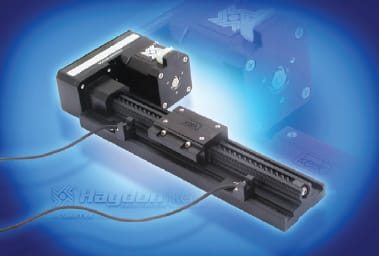 Haydon Kerk Motion Solutions (Waterbury, CT) has introduced the Kerk® RGS/RGW linear rail platform, now including a 180° folded-over motorized design that allows for a small footprint linear actuator system. The folded-over linear rail contains stepper motor, belt, and pully, precision lead screw, bearing supports, and rail with load carriage. The rail also contains the capability of mounting sensors within the integrated dovetail grooves. The standard drive ratios available from the motor to the screw are 2:1, 1:1, and 1:2, using lightweight aluminum pulleys and a fiberglass reinforced neoprene timing belt. Screw leads available range from 0.050 in/rev to 1.2 in/rev. When using a 2:1 ratio, a 0.050 in/rev lead screw, and a 200 step/rev stepper motor, a positioning resolution of 0.125 thousandths is possible.