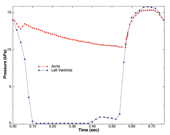 Translational degrees of freedom were fixed for the valve edges. Left ventricle and aorta pressure profiles were applied to the end plates (Fig. 2).1 The pressure profiles start from the point at which the pressure inside the left ventricle and the aorta are the same, since the initial condition of the valve was stress-free. The same pressure was applied to the fluid as an initial condition. The end plates were not allowed to rotate, and because the finite volume of fluid is incompressible, the two rigid plates were constrained to have the same displacement along the axial direction using an equation constraint.