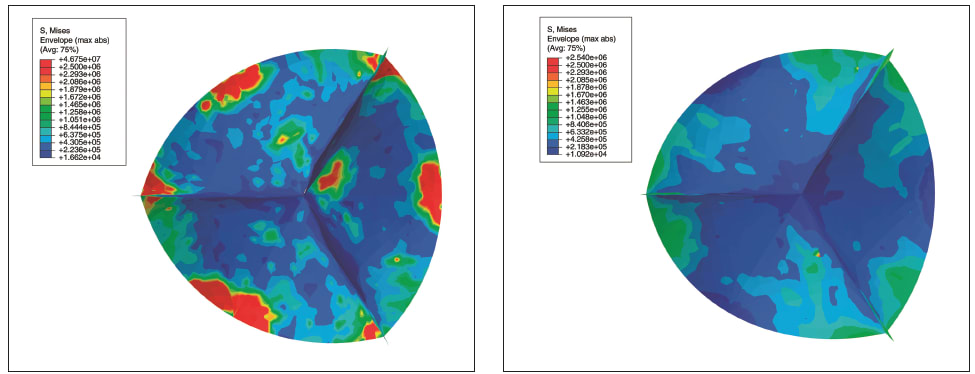 Peak stress in the valve leaflets occurs during the diastolic phase, when the valve leaflets are closed. Higher stresses are observed in the FSI analysis using SPH than the reference model (Fig. 3). The distribution of stresses is also different. Stress hot spots are observed in the middle of the leaflets as well as near the corners where two leaflets meet. This shows that, in addition to the pressure loads, the inertia effect of the fluid also influences the stress analysis results.