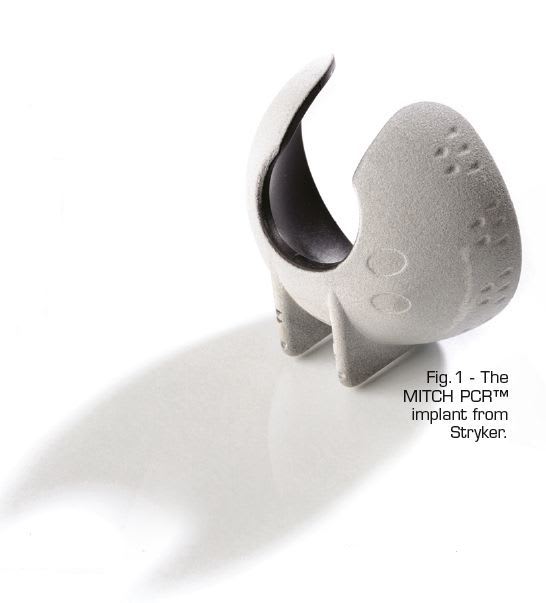 In 2007, the MITCH PCR™ implant from Stryker (Fig. 1) used the properties of MOTIS® (a milled pitch carbon-fiber reinforced compound of PEEK-OPTIMA) in a unique design. In testing of the device to 25x106 cycles using a 54mm head diameter hip simulator by the University of Durham, a steady state wear rate of 1.13 mm3/million cycles was seen.1 This wear rate is comparable to those reported for metal-on-metal bearings and more than an order of magnitude lower than those seen in metal-on-polyethylene bearings of a smaller size. Debris from these tests has been shown in several studies to elicit a similar biological response as polyethylene on a like-for-like dosing level. Additionally, the structural integrity of the MOTIS material allows a cup that is just 3.5 mm thick and incorporates a horseshoe design that mimics the natural geometry of the meniscal cartilage in the acetabulum. After more than three years of implantation in 25 patients, this joint replacement has not been revised for any issues related to wear of the primary bearing surfaces.