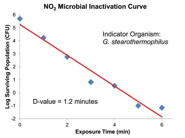 While temperature is not controlled, relative humidity (%RH) is a critical process variable. Lethality proceeds more rapidly with increasing humidity, but an SAL of 10-6 can still be achieved at reduced %RH with increased cycle duration. A cycle with 80%RH will typically require a sterilant exposure time of 20 to 40 minutes, while an exposure with 2 sterilization process. If %RH is not critical to device integrity, then the higher humidity cycles minimize the overall exposure to the NO2 gas.