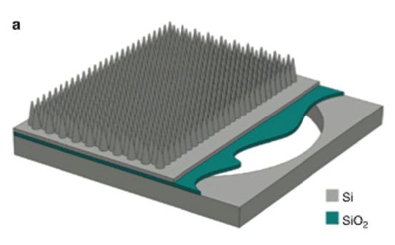 The experimental device is a mechanical resonator 50 microns in diameter made of a thin silicon-silicon dioxide membrane with ordered, tightly packed vertical nanowires on top. The design achieves a high surface-to-volume ratio for biomolecule detection, which means it can detect molecules at very low — down to femtomolar — concentrations. The sensor could be useful, for example, for finding just a few molecules in a glass of water.