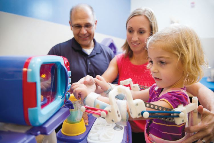 When a two-year-old named Emma, suffering from arthrogryposis, who could walk but not lift her arms to feed, play, or hug, needed to be fitted with the WREX, its designers needed to create a smaller and more lightweight version than was possible with traditional tools. They turned to 3D printing to design and create a prototype WREX in ABS plastic. The resulting parts were lightweight enough to attach to a little plastic vest for her, as shown in Figure 7. To see a video of Emma using what she calls her “Magic Arms,” go to http://www.techbriefs.com/tv/emmaWREX .