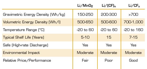At present, Li/CFx technology offers the highest theoretical energy density of any available battery chemistry. Today’s commercially available products typically use only 10 percent of their theoretical value, thus providing dramatic potential for future development. A comparison of key features of these three battery chemistries is presented in Table 1.