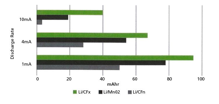 Another major advantage of the advanced CFx battery is its ability to exceed all others in both power density and maximum safe current draw. Laboratory tests have demonstrated up to an eight times improvement in high-current applications and a nearly two times improvement in low-current applications. This makes the advanced CFx battery particularly well suited for applications that require high sustained or pulse currents. (See Figure 1)
