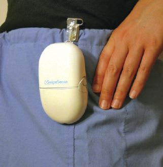 SwipeSense uses recent advances in both sensor and web technologies to solve hand hygiene challenges. A portable, trackable hand sanitation device that clips onto the scrubs of a physician or nurse, SwipeSense dispenses one dose of alcohol-based hand sanitizer with the squeeze of a hand. Embedded electronics in each device transmit individual hand hygiene data to a web application in real-time via a sensor network plugged into outlets throughout the hospital.