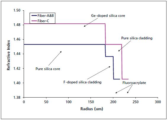 Fibers A and B have a pure silica core and F-doped silica cladding with an NA of 0.22. Fiber C has a Ge-doped silica core and pure silica cladding with an NA of 0.29. All three fibers have UV cured fluoroacrylate coatings and ethylene tetrafluoroethylene (ETFE) buffers. The fluoroacrylate coating has a lower refractive index than that of silica. It also performs as a second cladding that guides light in the silica cladding. The index profile of the fibers is shown in Figure 1. The fluoroacrylate coating of Fiber A is labeled as HCS®-1 (trade name HCS®). The fluoroacrylate coating of Fibers B and C is labeled as HCS-2 (trade name HCXtreme®).