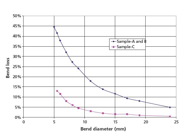 The result is shown in Figure 4. At a 6mm bending diameter, bend loss of Fibers B and C are 38% and 12% respectively.