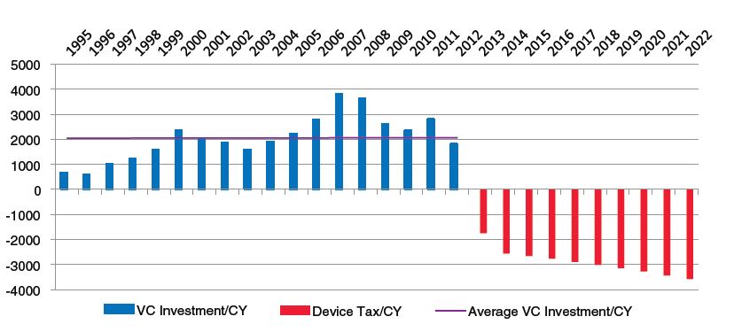 Using these figures as a measuring stick, it might be said that the device tax will be taking out of circulation nearly eight years’ worth of record-level investment in medical device innovation— and more than 14 years’ worth at the historical average. Under any foreseeable market conditions, it is unlikely that such a funding gap can be filled by existing investors or established device companies.