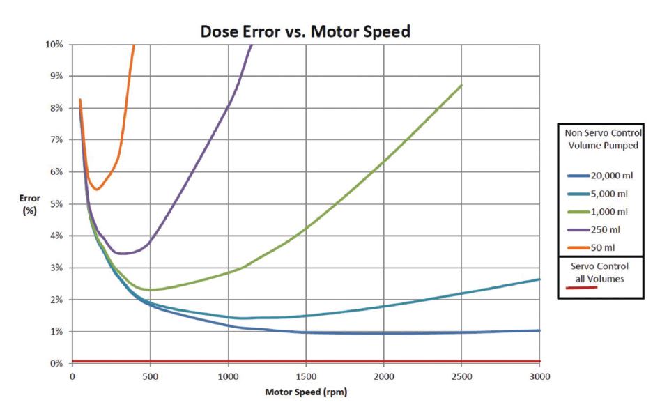 Data results for the non-servo control method show that dispensing error is dependent on motor speed as well as volume dispensed. Because the error varies with volume pumped and pumping speed, the non-servo pump drive must vary speed as the pumped volume increases in order to minimize error. This error is compounded by the poor low speed control characteristics of non-servo velocity control systems.