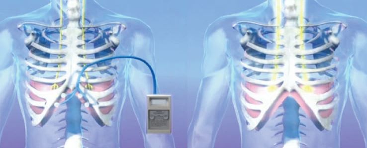 The device, which is implanted using minimally invasive laparoscopic techniques, provides electric stimulation to the muscle and nerves in the diaphragm. When stimulated, the diaphragm contracts, conditioning the muscle and improving resistance to fatigue under normal exertion.