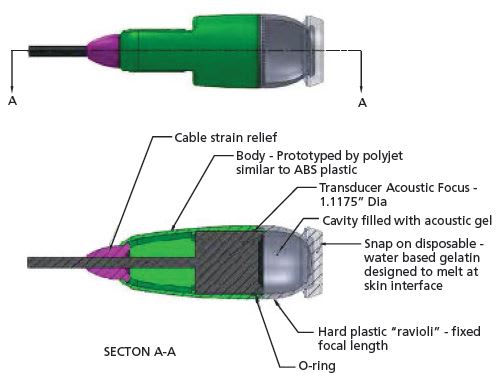 For the alpha prototype, it was important to develop an evaluation system that makes it easy to test in a broad range of contexts. In order for the transducer to couple with skin, it was decided that at the tip of the transducer housing, a flexible “ravioli” interface containing acoustic gel would be used. For the electronics housing, the design was based on wanting to adjust four parameters using uncomplicated controls: ultrasound frequency, pulse repetition frequency, pulse length/duration, and stimulus length. For the initial prototype, there were three defined points for these parameters that were achieved using adjustable potentiometers for each parameter. The electronics housing has a simple design with a power cord, on/off master power switch, coax transducer attachment, and a “deliver therapy” button.