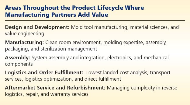 Manufacturing partners can help device companies accelerate time to market for a new product, thus speeding up return on investment. For low-volume devices in particular, manufacturers may find it cost-prohibitive to hire the experts and purchase the technologies that are required. Because many design and manufacturing services companies already have facilities, staff, equipment, and supply chains in place, they can begin design, optimization, testing, or manufacturing quickly. (See Figure 3)