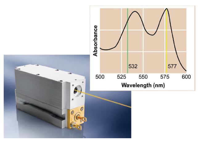 This has been commonly accomplished using the 532 nm output of diode-pumped, solid-state (DPSS) lasers, since this wavelength is near a weaker absorption of oxy-hemoglobin. However, the visible absorption spectrum of oxy-hemoglobin actually peaks at 577 nm. (See Figure 2) Fortunately, a relatively new type of visible laser—the optically pumped semiconductor laser (OPSL)—can be designed for any arbitrary wavelength over most of the visible spectrum.