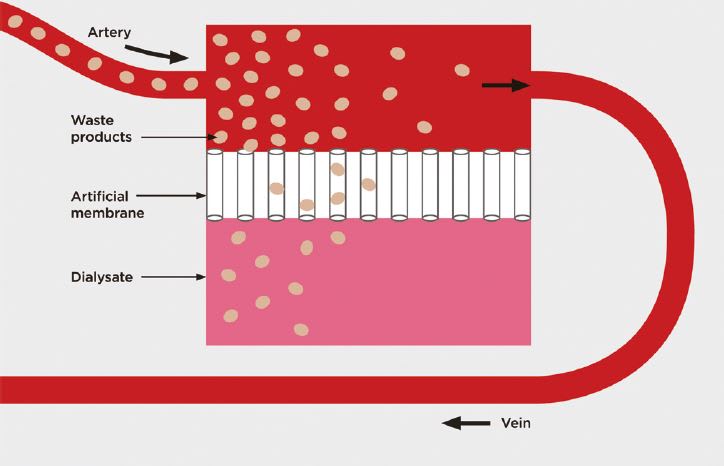 Hemodialysis and hemofiltration are the most common, and use an external dialyzer to filter blood, usually removed from an arteriovenous fistula in the patient’s arm. Hemodialysis is the more traditional form of dialysis, relying on diffusive transport and low porosity membranes to remove small, toxic, and easily diffusible solutes from the blood, such as creatinine and urea. (See Figure 1)