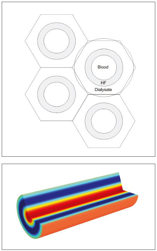 Not only does convection and diffusion across the porous membrane affect dialysis, but complex interactions affect the process as well. One complication is backfiltration, which takes place from the dialysate back into the filtered blood. This solute flux is the result of hydraulic and osmotic pressures that build up between the membranes of the dialyzer and drive forward and back filtrations. Dr. Conrad’s simulation used the Navier-Stokes and Brinkman equations to predict backfiltration under such conditions, and take into account the increasing solute concentrations and pressures of the dialysate as the blood continues down the dialyzer. To further complicate the process, the dialysate has a cooler temperature than blood, and heat loss to the environment must also be taken into account, which can be coupled and simulated with the multiphysics approach.