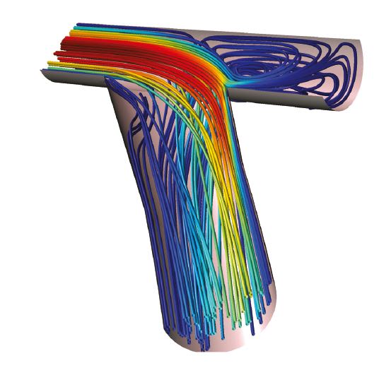 In addition to examining transport processes in the hollow fibers, Dr. Conrad is also looking at blood flow in the grafts used for vascular access, which have an unacceptable failure rate. An example of the complexity of these simulations can be seen in Figure 3. Secondary flows in the ligated arterial segment and swirl flows in the graft segment are easily identified. Simulation can predict the pressure loss in the circuit, and provide insight into the deterioration of the graft function over time. “Vascular access complications represent the greatest cause for hemodialysis patient hospitalizations,” said Dr. Conrad. Simulation can help understand and prevent these complications and optimize fluid flow from vascular access grafts.