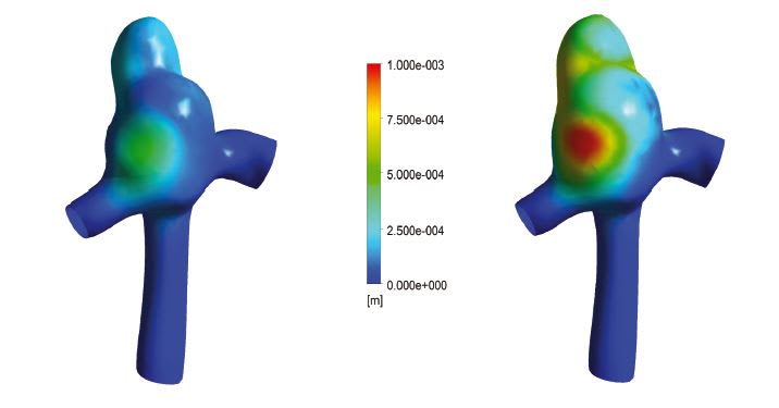 Professor Vincent Costalat, MD, PhD, and Dr. Mathieu Sanchez in Montpellier, France, have combined transient biomedical imaging with hemodynamic fluid structure interaction in patient specific aneurysm. They are able to specifically simulate the proper calibration of artery wall material properties adjusted to the patient and observe how the transient aneurysm deformations yields to the soft tissue elastic interact. This reveals a clear difference between properties of ruptured and unruptured aneurysms and the combination of in vivo and in silico experiments opens the door to computer-aided diagnoses for rupture of aneurysms.