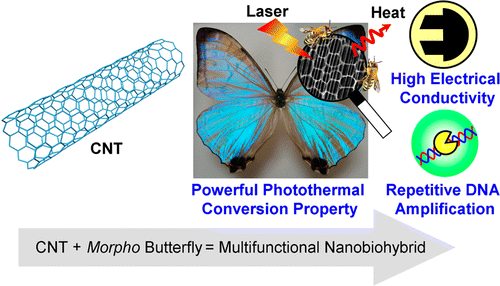 They grew a honeycomb network of carbon nanotubes on Morpho butterfly wings, creating a composite material that could be activated with a laser. The resulting material heated up faster than the original components by themselves, exhibited high electrical conductivity and had the ability to copy DNA on its surface without absorbing it.