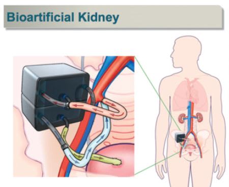 Using silicon nanotechnology similar to computer microprocessor technology, the bioartificial kidney joins nano filters made of silicon with living human kidney cells cultured in the lab from samples harvested from deceased donors. The donated cells form a membrane positioned downstream from the device’s intake filter, out of reach of the body’s immune response, to avoid rejection. The device, he says, runs on the body’s normal blood pressure, with no other power source required.