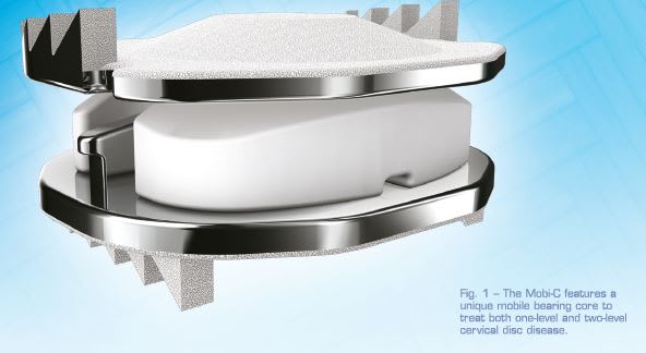 There are six cervical discs currently approved in the US—three of which were approved between 2007 and 2009, and another two approved by the FDA in 2012 (Globus’ Secure-C, and NuVasive’s PCM). Five of the available cervical discs in the US are approved for 1 level cervical disease only. In late August, LDR, Austin, TX, received approval from the FDA for the Mobi-C cervical disc replacement device, the first and only cervical disc replacement device to receive FDA approval to treat both onelevel and two-level cervical disc disease. (See Figure 1)Differentiating Mobi-C from other artificial cervical discs is its unique mobile bearing core which allows for controlled angulation and translational motion. In addition, it is implanted without a keel that is cut through the adjacent vertebral bodies like many existing discs on the market. The device’s patented mobile bearing core allows for flexion/extension and lateral bending coupled with translation similar to natural cervical motion.