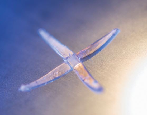The lab made spiraling, curling, and X-shaped materials that alternately closed in or stood up on four legs. Placing polystyrene on top of one half of a strip of LCE and on the bottom of the other half produced an “S” shape. The primary direction of folding or wrinkling of the material was set by the temperature at which the polystyrene layer was deposited.