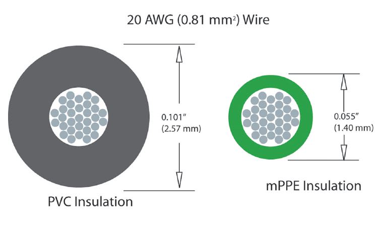 Surprisingly enough, the costs to replacing PVC in medical devices are far outweighed by the benefits of such alternatives on the market. Companies such as Alpha Wire have developed compounds with superior dielectric properties that allow for a reduced wall thickness, resulting in a smaller, lighter, and tougher wire and cable. The company’s modified polyphenylene ether (MPPE) insulation is successfully used on both wire and cable products, is 100% recyclable, and contains no PVC, halogens, or phthalates. Advantages to using a PVC alternative are increased two-fold when the manufacturer can also decrease the size, weight and outgassing of its internal components. (See Figure 2)