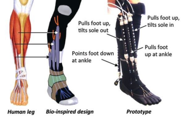The soft orthotic device enabled the researchers to mimic the biological structure of the lower leg. The device's artificial tendons were attached to four PAMs, which correspond with three muscles in the foreleg and one in the back that control ankle motion. The prototype was capable of generating an ankle range of sagittal motion of 27 degrees, sufficient for a normal walking gait.