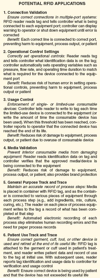 Enforce required limits on device usage: The control unit can tell the reader to write to the tag attached to a limited-use device each time the device is connected to equipment. Or the reader can be told to write to a consumable device the amount of time the device has been used. When the threshold is reached in either case, the control unit reports to the operator that the connected device has reached the end of its life.