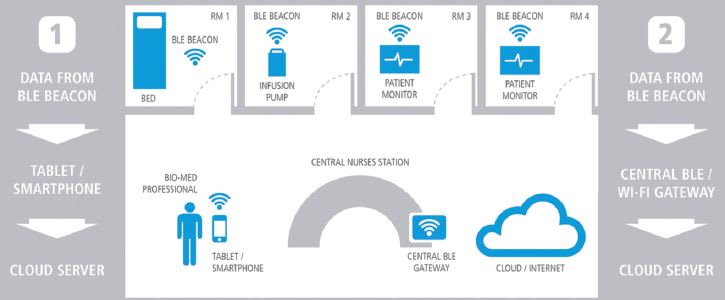 Currently, trying to find your way around a large hospital campus, finding a particular bed, or locating a high-value medical device, such as a patient monitor, can be a challenging and frustrating task. However, the use of BLE-based beacon technology could potentially change that. There have been many attempts to deliver proximity/advertising-type applications via Classic Bluetooth but these have tended to be inflexible, complicated, and costly due to the nature of the legacy Classic Bluetooth specification on broadcasting.
