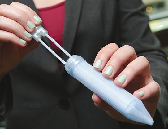 The two chemicals—a polyol and a diisocyanate—that produce the foam remain in canisters that are stored separately within the injector device before they are needed. The students designed the canisters to keep the chemicals stable in military conditions at temperatures up to 100 degrees F for at least one year. The injector is about the size of a whiteboard marker. On the battlefield, the soldier administering the treatment would mix the two chemicals with a mechanism inside the injector. Then, pushing down the plunger would insert the expanding foam into the wound to reduce bleeding.