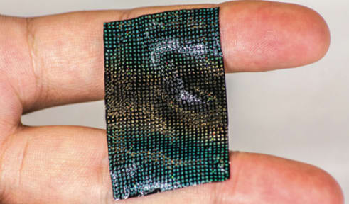 The small device, which looks like a patch approximately five centimeters square, can be placed directly on the skin and worn 24/7 for around-the-clock health monitoring. Its wireless technology uses thousands of tiny liquid crystals on a flexible substrate to sense heat and change colors to indicate a particular condition.