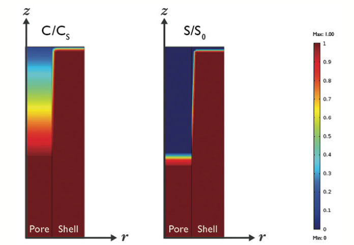 Schauer and Guler tracked both the dissolution of solid drug and the diffusion of dissolved drug. As it dissolves within the pores, the pores fill with liquid media from the surrounding tissue. The medicine has a different solubility limit in the liquid media than it does in the polymer, which results in a discontinuity in the dissolved medicine concentration at the interface between pore and shell. As Guler explained, “The appropriate interface conditions were easily implemented in COMSOL using a stiff-spring method, which ensured the continuity of the diffusive flux.” The customizable boundary conditions allowed Schauer and Guler to easily add the necessary terms.
