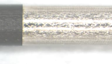 If a CO2 laser cannot be used for reasons of heat input control, the nanosecond laser should be considered next, specifically those with 532nm and 355nm wavelengths. Nanosecond lasers produce pulses of around 20 nanoseconds, removing wire insulation material with a much less thermal process than that of the CO2 laser. It can be used on smaller diameter wires, or where the removal edge must be welldefined with little or no burr. Figure 2 shows a wire that has been stripped using a nanosecond laser with a wavelength of 355nm.