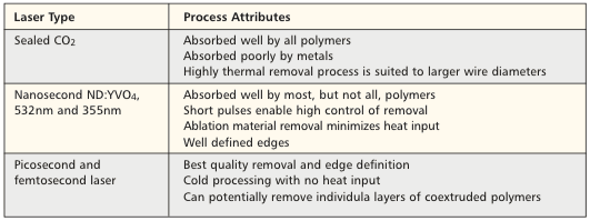 A number of different lasers can be used for wire stripping, depending upon the particular wire diameter, insulation material (polyimide, Pebax®, PET (poly ethylene terephthalate), nylon, and fluoropolymers), and feature requirements. Table 1 shows the lasers most commonly used for wire stripping, listed by suggested order of consideration, from top to bottom. For each combination of material, wire diameter, and required features, there is a suitable laser to match the desired criteria.