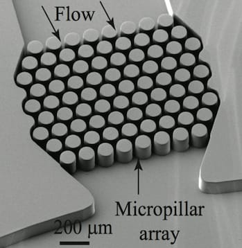 To induce gelation, Shen’s lab first molds a microfluidic platform out of transparent rubber, creating grooved channels through which liquid can travel. Sometimes the platforms look like thin rivers snaking through a microscope slide; other times the researchers place posts in the middle of a wider channel to create gaps of just few microns in width. Then, they pump a watery and soapy mixture through the platform, and it emerges from the other side as a thick gel. “In this way, we are able to change phase from water to something more like hair gel,” Shen explained. She estimates that her method requires just half of the chemicals that traditional gelation processes require. (See Figure 1)