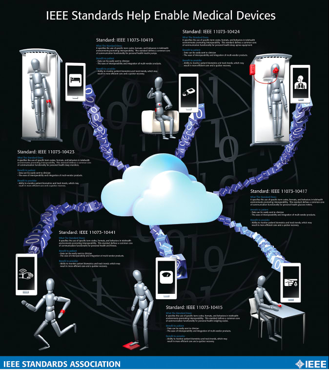 For example, one of the more recently approved standards in the family—IEEE 11073-10419-2015 “IEEE Standard for Health informatics - Personal health device communication - Device specialization - Insulin pump” ( http://standards.ieee.org/findstds/standard/11073-10419-2015.html )—defines a common core of communication functionality for personal telehealth insulin pump devices. Common terminologies, information models, application protocols, term codes, formats, and behaviors are proposed to improve interoperability among the devices used by diabetics.