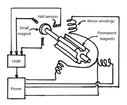 The logic circuitry uses rotor/shaft information to turn “on” specific power devices applying power to specific stator windings, thus generating a stator magnetic field. The PM rotor follows it. The Hall sensor feedback information allows for maintaining the optimum angle for rotation and for maximizing torque.