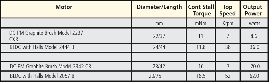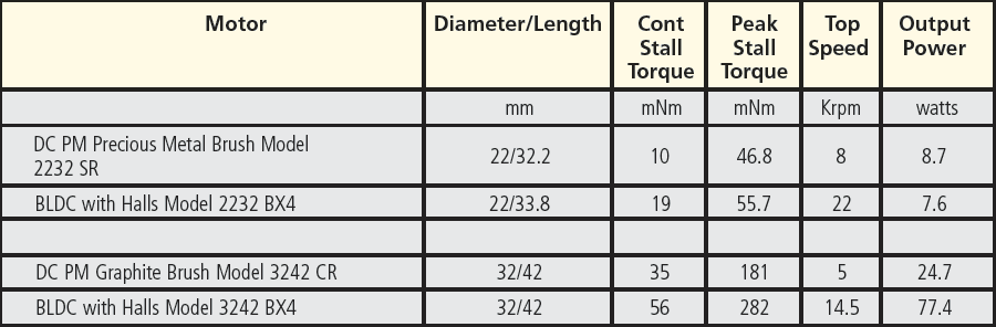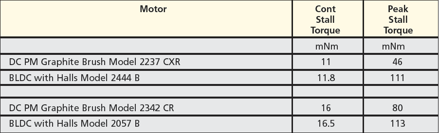 Specs for motors in the same package size are presented in Table 3. In this comparison, it is noted that brushless motors present a higher top speed capability— indicating potential for increased productivity. Brushless delivers more continuous stall torque, usually 20% or much more—indicating potential for getting into position faster with more precision and accuracy. Additional brushless motors provide more peak torque capability. In other words for brushless motors, torque per volume is maximized. (See Table 3)