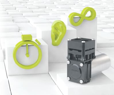 Gardner Denver Thomas, Inc., Sheboygan, WI, introduces the Thomas 1610 advanced diaphragm pump, which combines precise, consistent performance with very low sound levels, making it ideal for devices working near patients. Its design provides fast evacuation times for all applications where speed is key. Volume flow rate is up to 8.0 l/min, vacuum up to 90%, and pressure up to 2.0 bar.