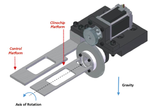 With the recently developed clinochip system, clinorotation time-lapse micros - copy is possible and enables time-lapse imaging of cells in simulated microgravity. The clinochip is a lab-on-chip configuration that accommodates elastic substrates, complex microfluidics, and same-cell tracking requirements to enable a wide range of science investigations. Cells can be cultured in monolayer, in suspension, or in 3D constructs. In all, the compact system provides not only traditional endpoint outcomes, but also dynamic cellular processes, while offering the ability to precisely modulate the microenvironment and fluid flow around cells. (See Figure 1)