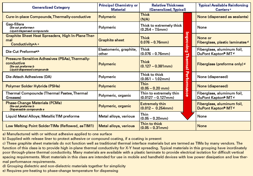 Eleven generalized categories of TIM materials are shown in Table 1. This compilation represents a set of general targets for type of material, basic chemistry or material employed, relative thickness ranges, and types of reinforcing carriers available. This compilation is intended as a general guide, as there are thousands of materials available globally from several hundred vendors that fit within the general term “thermal interface material.” This table is arranged in a general ordering, from the lowest-performing and thickness of materials to the highest thermal performance categories.