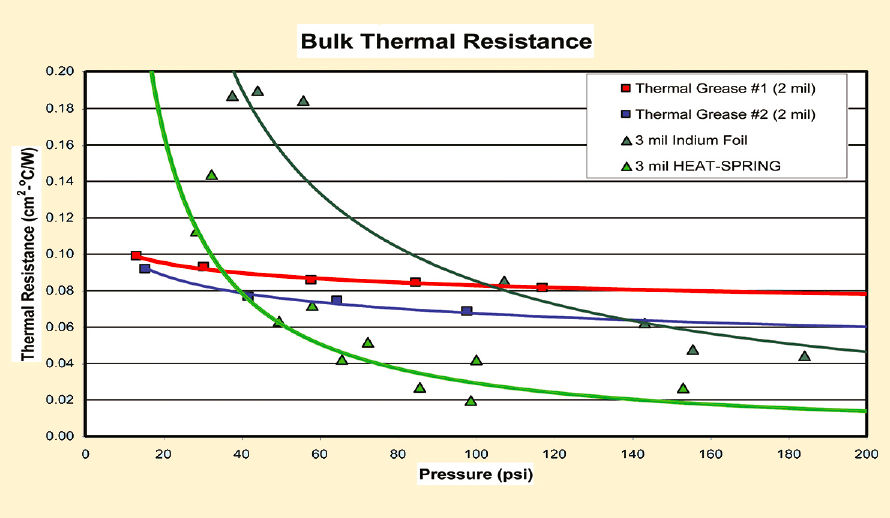 The highest-performing thermal material types are the fully-metallic material categories—when significant mechanical clamping force can be applied or the use of a reflowed lowmelting point solder (such as an indium alloy) is considered. This can be demonstrated in a standardized testing procedure, utilizing an established ASTM test methodology with increasing clamping force applied under laboratory conditions.