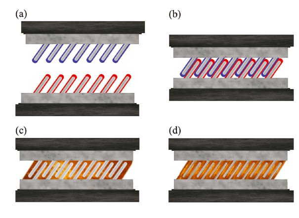 Huang explains: “There is a bottom ‘comb’ and a top ‘comb.’ We then interlace the ‘teeth.’ When the indium and galium touch each other, they form a liquid. The metal core of the rods reacts to turn that liquid into a solid. The resulting glue provides the strength and thermal/electrical conductance of a metal bond.” (See Figure 1)
