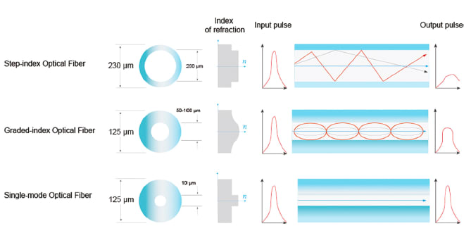 Single-mode optical fibers feature a small core size (typically less than 10 μm) and transmit signals using only one mode in the fiber core without modal dispersion. Step-index multimode fibers have a larger core (from 40μm to 1500μm) with a flat refractive index profile along the core’s radial direction which produces modal dispersion. Graded-index fibers have a smaller core size (usually 50 μm, 62.5 μm or 100 μm) with the refractive index profile gradually reducing from the center of the core out along the core’s radial direction (See Figure 1). Customers often first consider these structural and optical characteristics when selecting a fiber.
