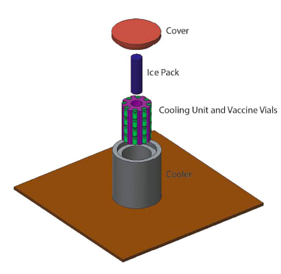 The researchers used the following materials in the simulations to represent the real product designs: Styrofoam for the cover and cooler, PVC for the cold pack and cooling unit, glass for the vaccine vials, and concrete for the ground that the box would be sitting on.